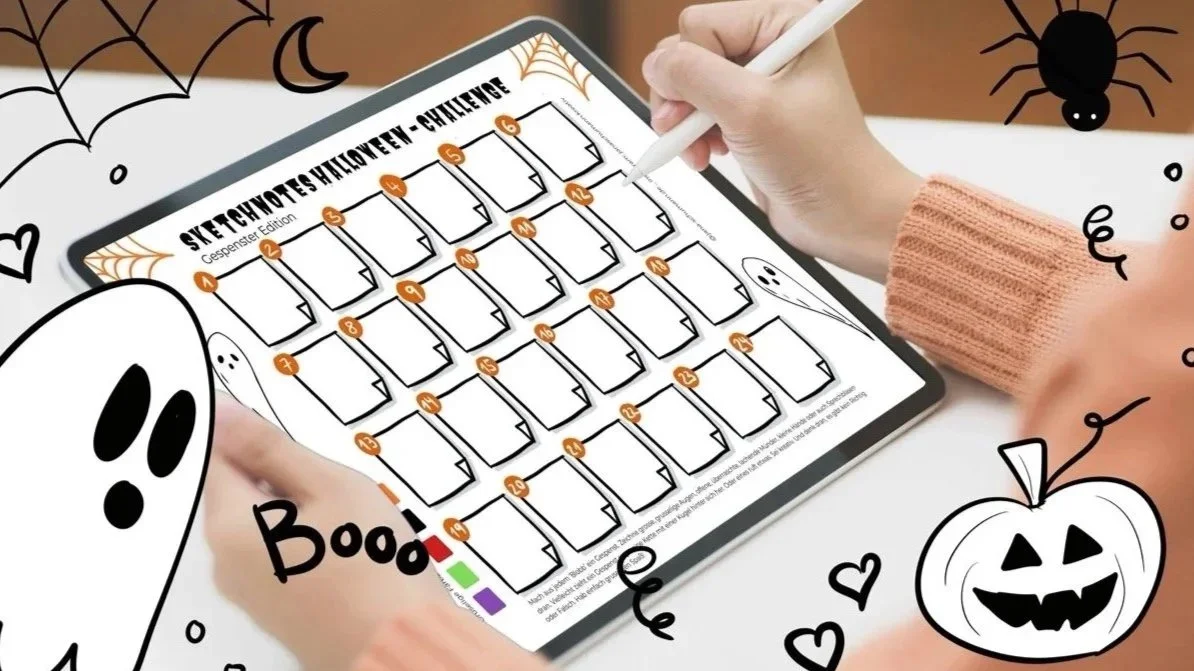 Die Halloween Sketchnotes Zeichen Challenge für Groß und Klein - für 0 Euro dabei sein und die Vorlage sowie den Zugang zu 24 Video Tutorials erhalten.